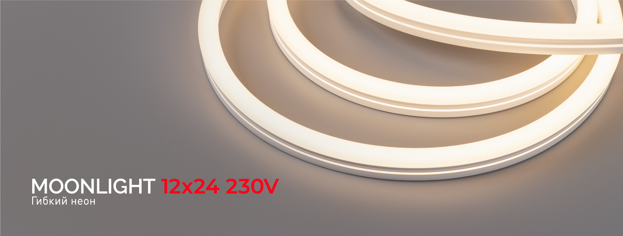 Гибкий неон MOONLIGHT предназначен для масштабных проектов! Его параметры: сечение — 12×24 мм, напряжение — 230 В, длина — 50 м. Ленты этой серии помогут осветить фасады зданий и архитектурных строений. Универсальность и легкость в подключении позволяет использовать неон MOONLIGHT как в коммерческих пространствах и экстерьерах, так и в частных.