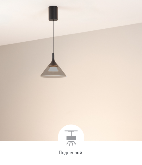 Стеклянный конусообразный плафон дымчатого цвета добавит в интерьер элегантность.