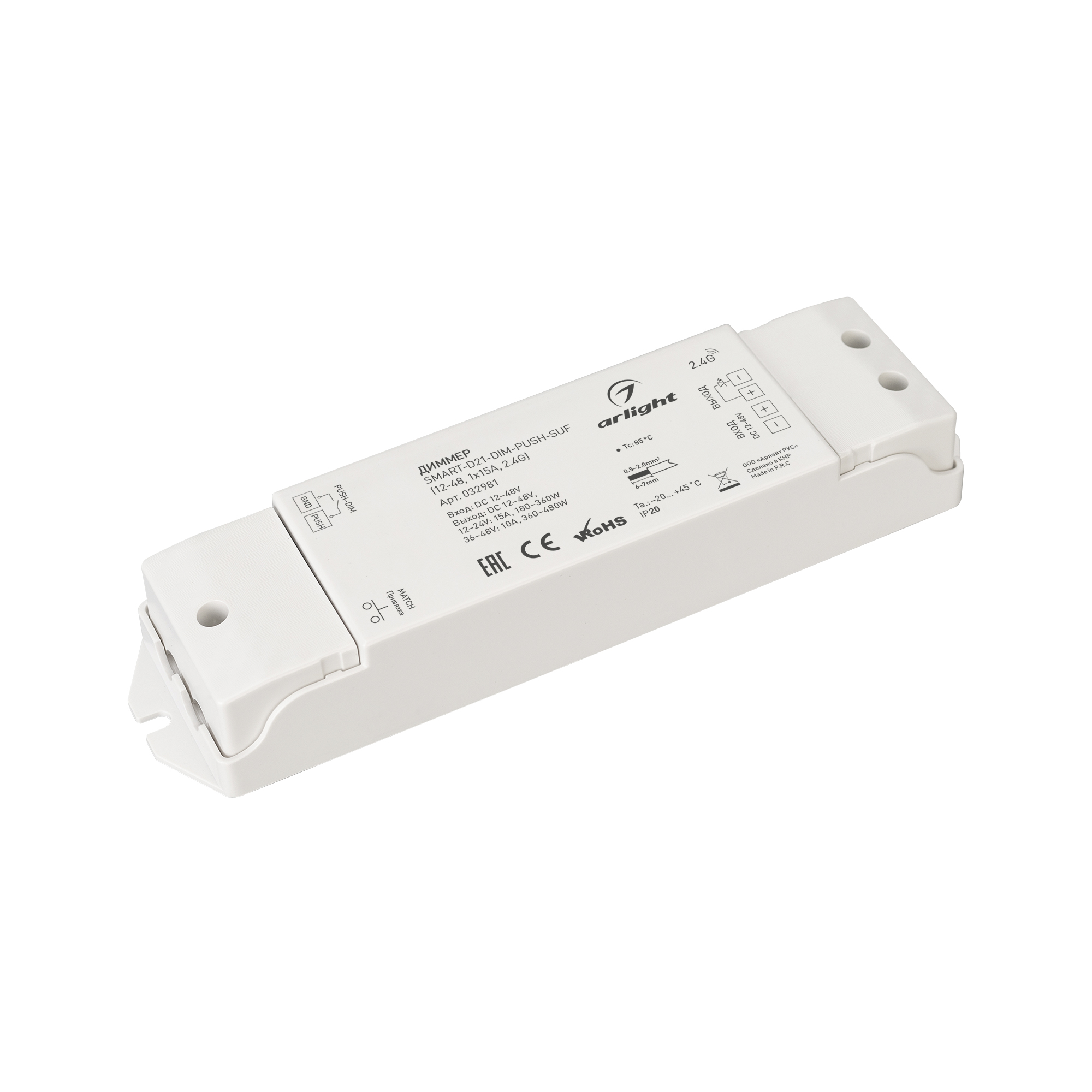 Диммер SMART-D21-DIM-PUSH-SUF (12-48, 1x15A, 2.4G) (Arlight, IP20 Пластик, 5 лет)