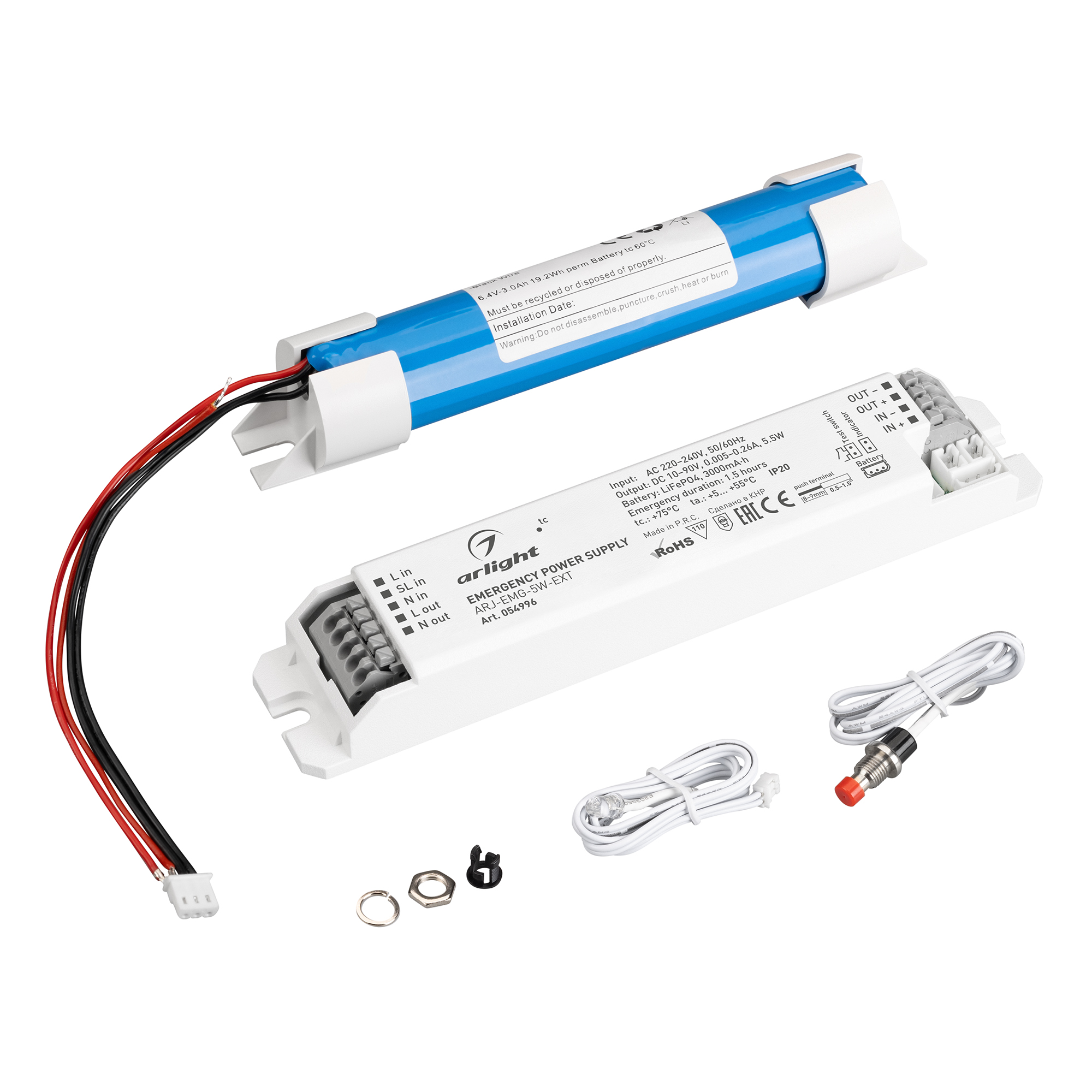 Поставка под заказ от 500шт. Блок аварийного питания с гальванической развязкой для светильников и мощных светодиодов. Входное напряжение 220-240 VAC. Выходные параметры: 5.5Вт, 10-90 В, 5-260 mА. Негерметичный пластиковый корпус с внешней аккумуляторной батареей IP 20. Ёмкость батареи 3000 мА/ч, время работы от АКБ до 1.5, потребляемая мощность в режиме заряда батареи 7Вт. Габаритные размеры длина 162 мм, ширина 31 мм, высота 21 мм (габаритные размеры АКБ 90x20x21мм). Гарантийный срок 3 года. Встроена функция Self-Test, автоматическое тестирование проводится раз в 30 дней.