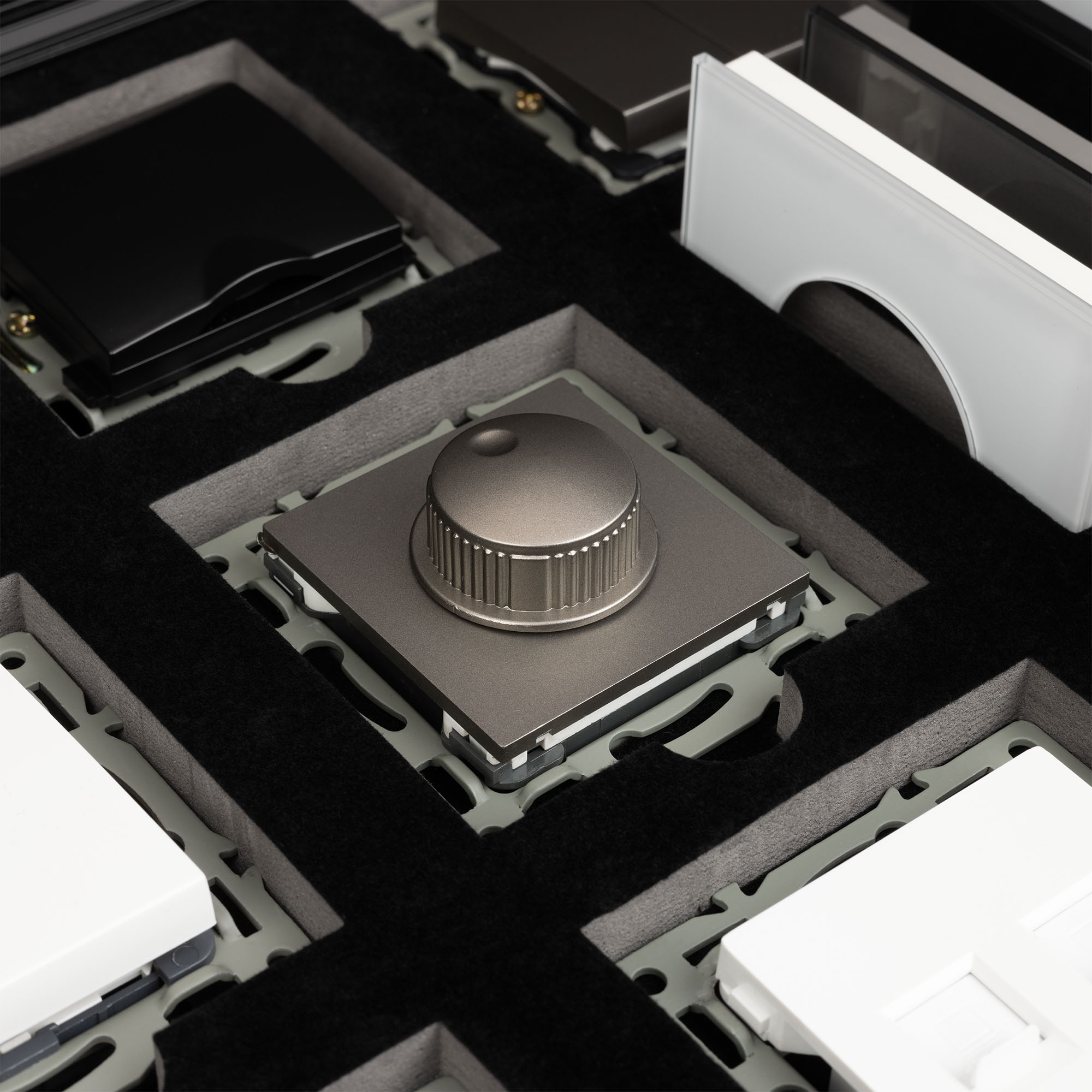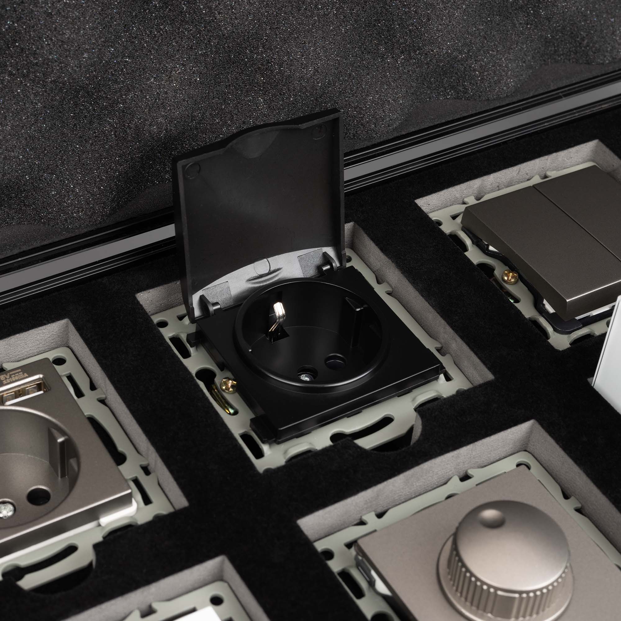 Демо-кейс с наполнением электроустановочных изделий серий VERSA, GLARE, PRESTO и сопутствующих механизмов. Демо-кейс содержит: Рамки серии VERSA в цветах белый, черный и серебристый (серый); Рамки серии GLARE в цветах белый, черный и серебристый (серый), в двух вариациях: со стандартным вырезом (квадрат) и с круглым вырезом (совместимые с механизмами арт. 043740/043739/043741); Рамки серии PRESTO в цветах черный и серебристый (серый), в двух вариациях: со стандартным вырезом (квадрат) и с круглым вырезом (совместимые с механизмами арт. 043740/043739/043741); Механизм выключателя на две клавиши (проходной) в серебристом (сером) цвете - арт. 043729 Механизм компьютерной розетки (двойной) в белом цвете - арт. 045336 Механизм розетки с дополнительными USB Type A выходами в серебристом (сером) цвете - арт. 043735 Механизм розетки под евровилку в черном цвете - арт. 043740. Механизм розетки влагозащищенный в черном цвете - арт. 043746 Механизм светорегулятора в золотом цвете - арт. 045795 Механизм выключатель на одну клавишу (перекрёстный) в белом цвете - арт. 043718 Заглушка для розетки в белом цвете - арт. 044892 Рамки представленных серий накладного типа монтажа - не требуют дополнительного оборудования для установки рамки на механизме.