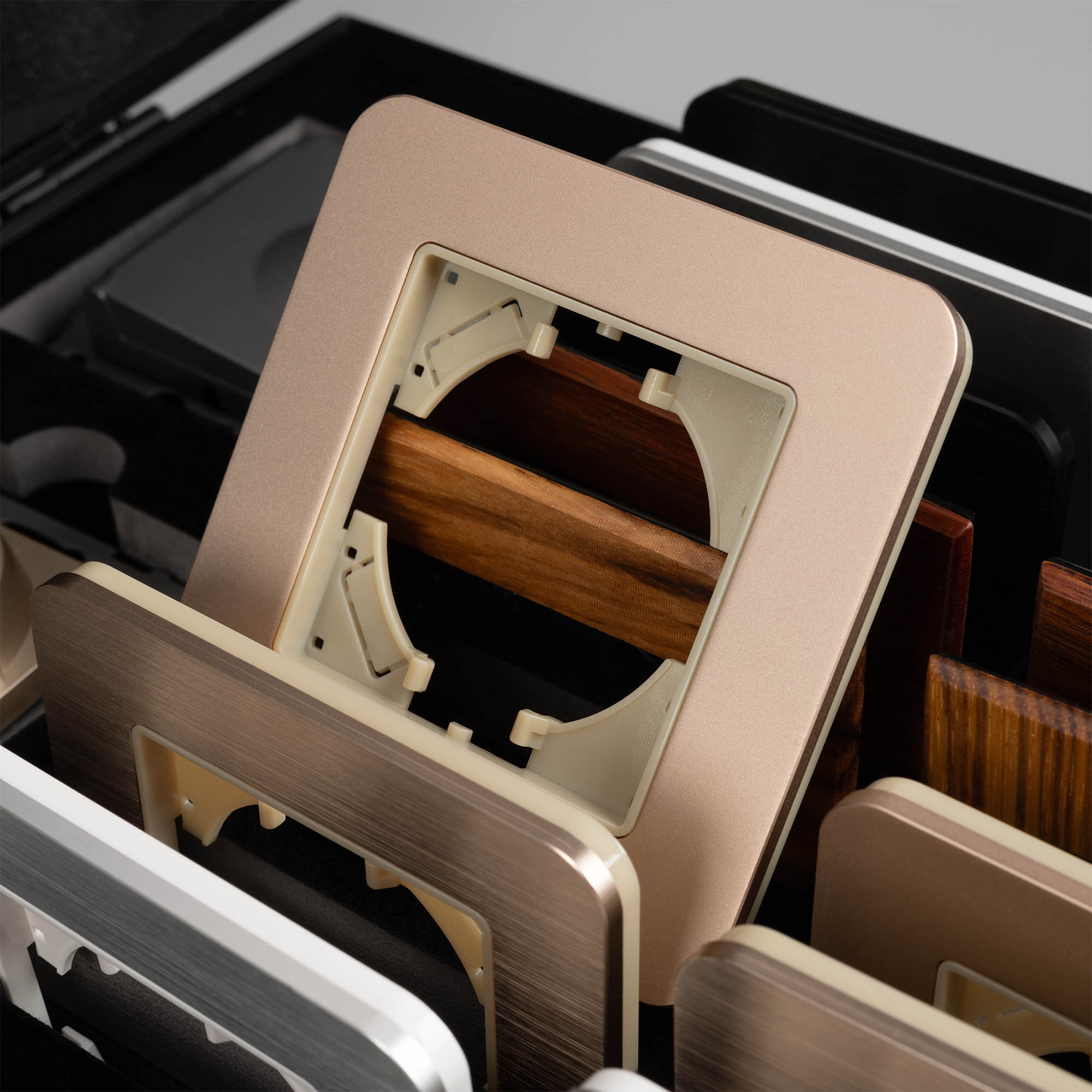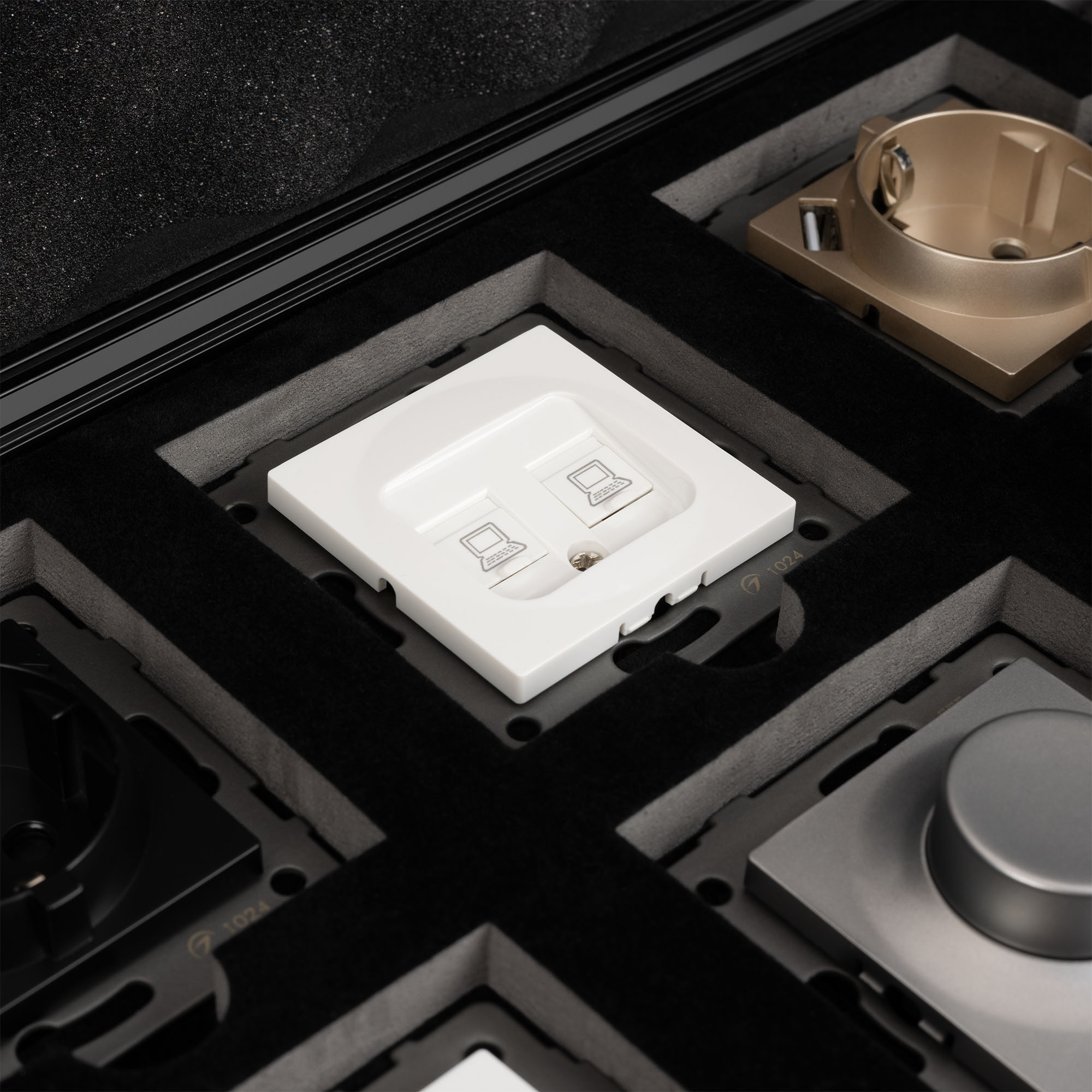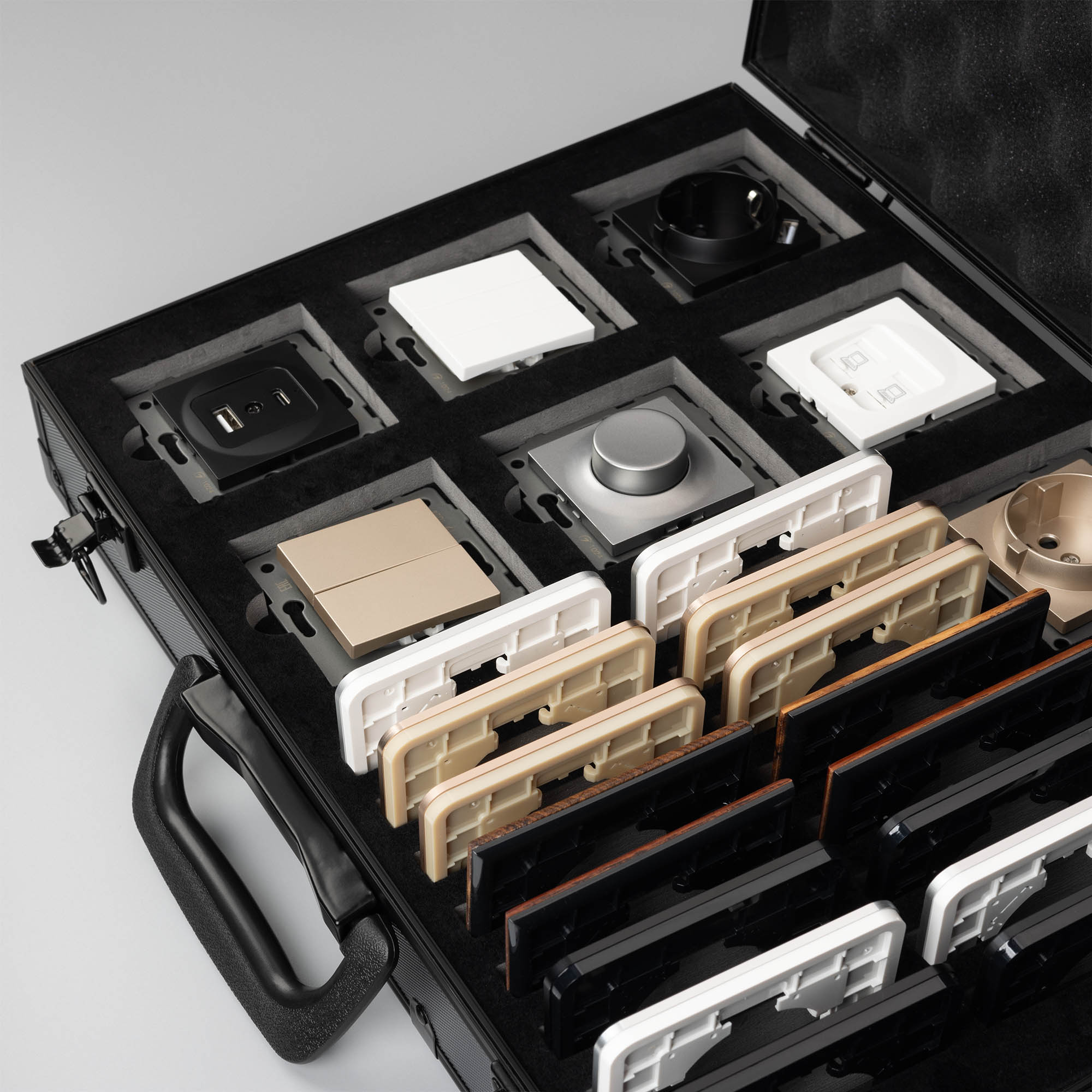 Демо-кейс с наполнением электроустановочных изделий серий AKIRY, XSILO и сопутствующих механизмов. Демо-кейс содержит: Рамки серии AKIRY в цветах золотой, черный и серебристый (серый). Поверхность рамок имеет сатинированное и Soft-Touch покрытие; Рамки серии XSILO в цветах светлого и темного дерева, рисунок структуры которых уникальный для каждой рамки. Механизм USB розетки в черном цвете - арт.049838 Механизм компьютерной розетки (двойной) в белом цвете - арт.049854 Механизм розетки с дополнительными USB Type A + Type C выходами в золотом цвете - арт.049832 Механизм розетки с дополнительными USB Type A + Type A выходами в черном цвете - арт.049819 Механизм выключателя на три клавиши в белом цвете - арт.049896. Механизм выключателя на две самовозвратные клавиши в золотом цвете - арт. 049886 Механизм розетки влагозащищенный в серебристом(сером) цвете - арт. 049836 Механизм светорегулятора в серебристом(сером) цвете - арт. 049865 Рамки представленных серий накладного типа монтажа - не требуют дополнительного оборудования для установки рамки на механизме.