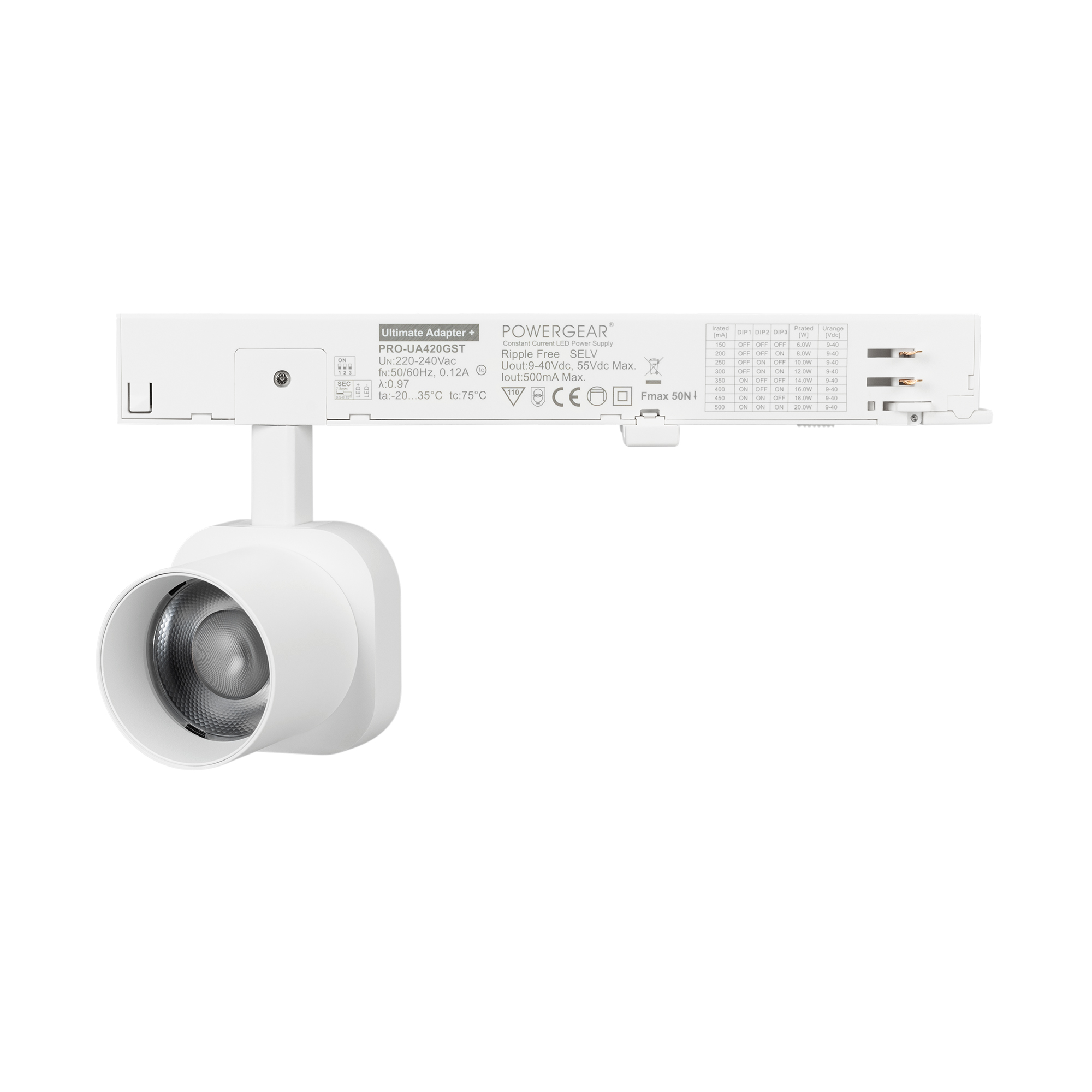 Светильник для треков/шин 4 провода. Мощность 10 Вт, св. поток 650 лм, 65 лм/Вт, теплый 3000 K, CRI>95, угол 20°, напряжение питания 230 В. Решетка HONEYCOMB в комплекте. Белый квадратный корпус из алюминия, материал линзы PC поликарбонат, степень защиты IP20. Размер световой части 60х60х62 мм. Монтаж на трек 3-фазный. Драйвер встроенный 9-40 В, 250мА., пульсация <1%