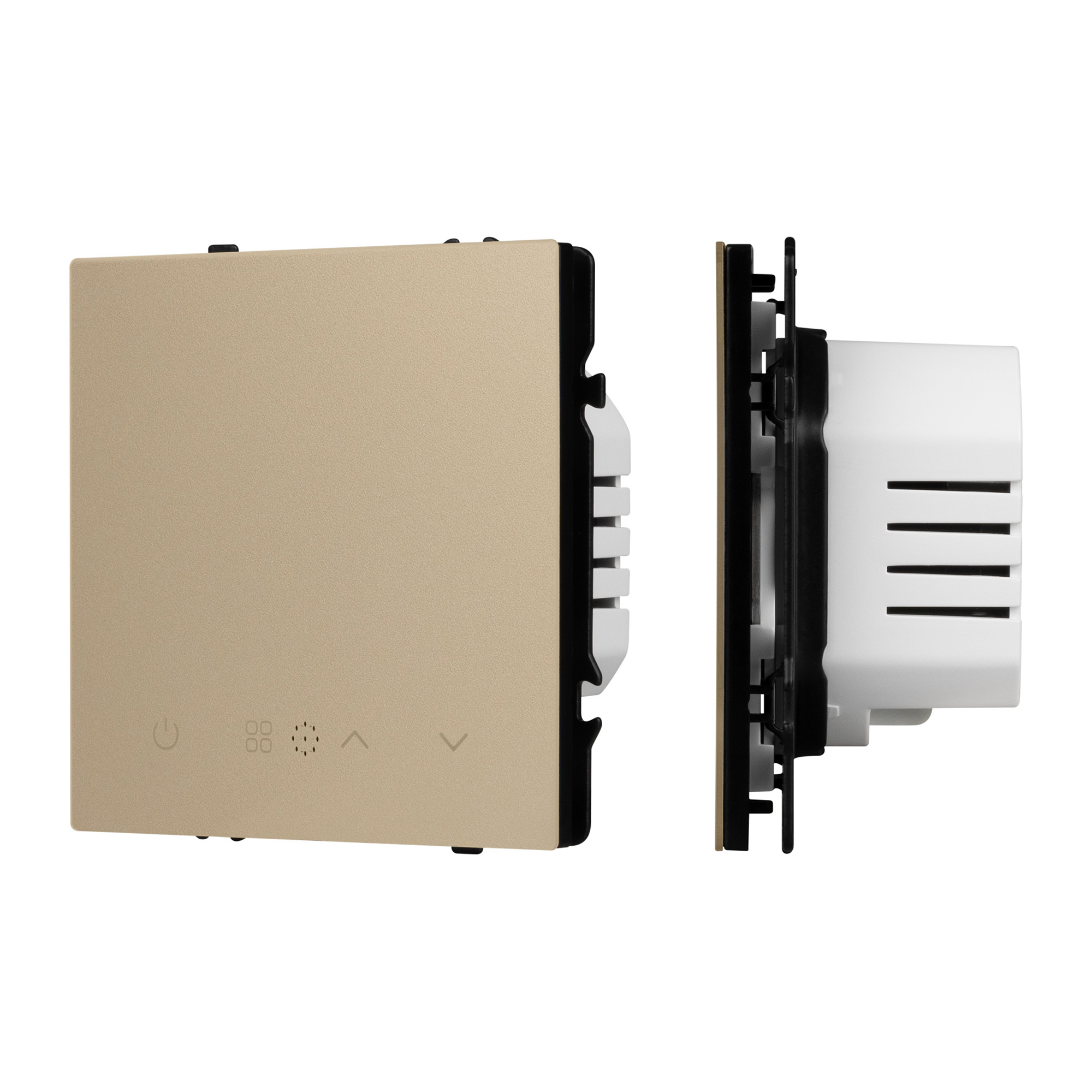 Строгие геометрические линии гармонично сочетаются с функциональностью продуманных механизмов, создавая идеальное решение для дизайн-проектов, где важны как эстетика, так и практичность. Терморегулятор совместим с рамками серии NOBE, создает утонченный минималистичный вид. Скрытый тип монтажа позволяет гармонично встроить в интерьер любого современного дизайн-проекта. Видимая часть механизма выполнена из глянцевого поликарбоната цвета золотой песок, что придает изделию приятные тактильные ощущения и стильный внешний вид. Настройка работы электрического теплого пола осуществляется за счет выбора необходимых значений не посредственно как на самом устройстве, так и при подключении по беспроводной сети Zigbee в приложениях SmartLife и Умный Дом (Яндекс). Суппорт окрашен в черный матовый цвет под основу механизма и выполнен из металла толщиной 1,5мм, что обеспечивает безопасность и уверенность в установке. На каждой стороне суппорта размещены фиксирующие элементы, позволяющие комбинировать механизмы в системы до 5шт как горизонтально, так и вертикально.