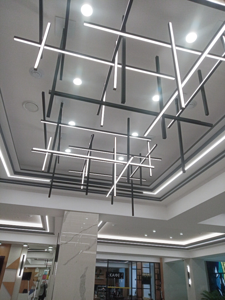 Для декоративной подсветки были выбраны линейные светильники, созданные на базе анодированных профилей и светодиодной ленты белого свечения. Основное освещение реализовано с помощью встраиваемых круглых потолочных светильников и широких световых полос. Основой светотехнического проекта стали лаконичность, минимализм и простая геометрия линий.