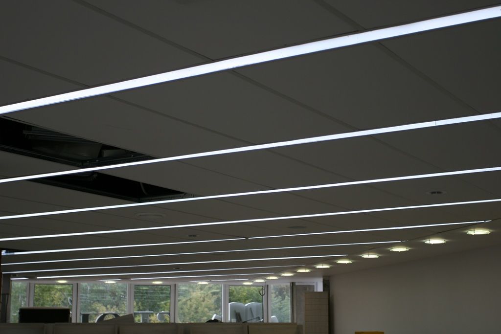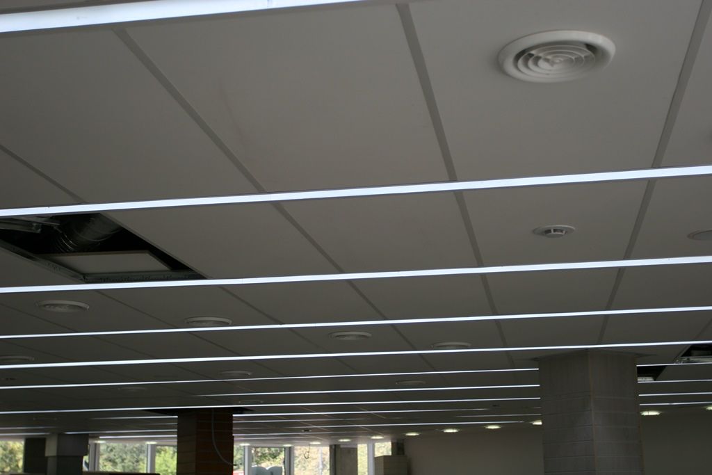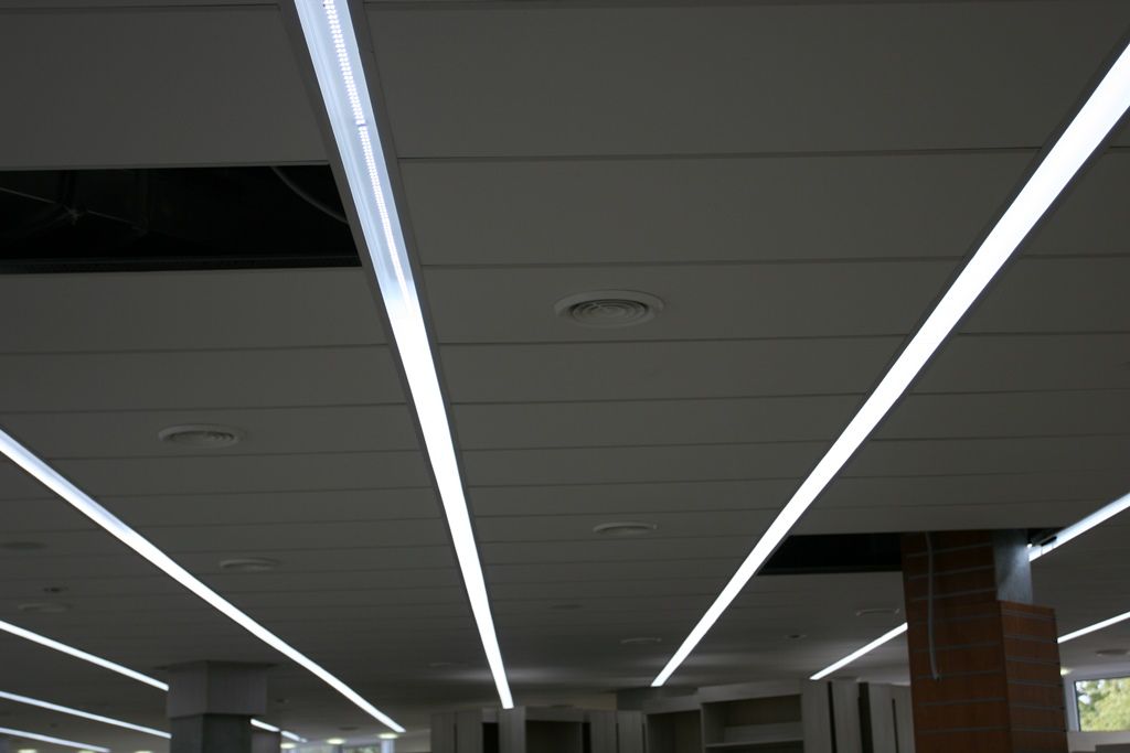 Светодиодное освещение торговых площадей в книжном магазине было выполнено двумя способами. Первый - освещение многоуровневого гипсокартонного потолка, второй - линейные светильники с матовым стеклом, встроенные в потолок Армстронг. Эти светильники создали эффект равномерных световых линий. В обоих вариантах освещения применялось светодиодная продукция торговой марки arlight®.
